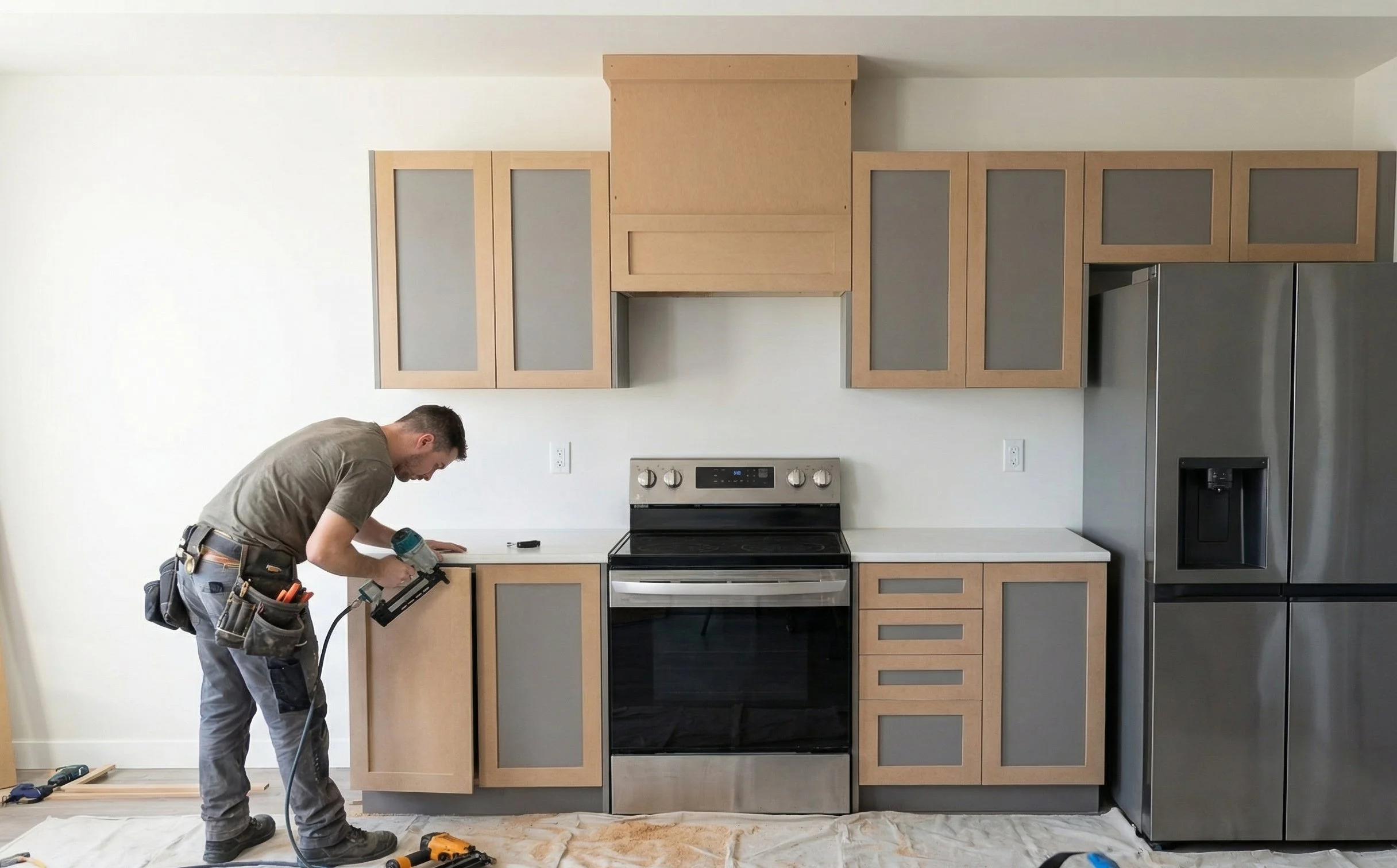1. This original builder’s-grade kitchen had great potential from the start. We decided not to replace the doors; instead, we applied MDF wood planks to the existing flat panels to create the look of Shaker-style doors. We also built a custom dummy slipcover hood around the existing stainless-steel hood, seamlessly integrating it with the cabinetry.