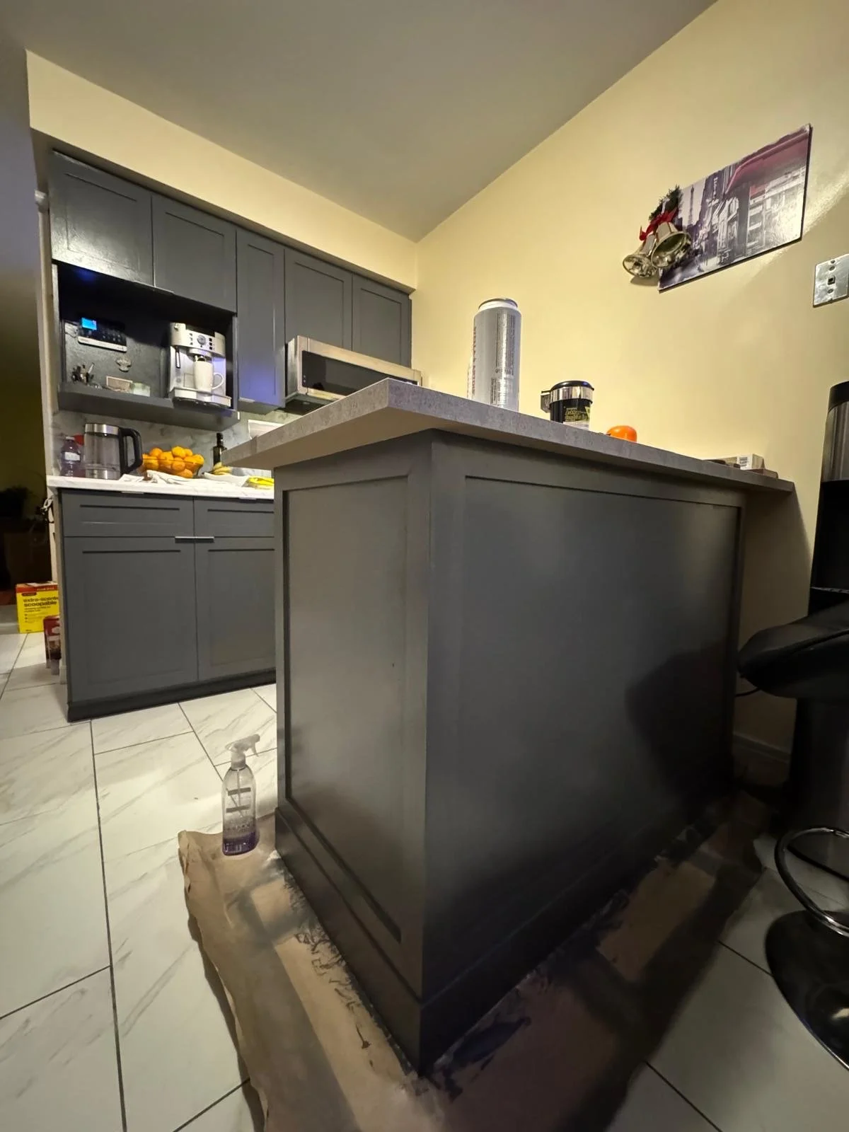 4. We replaced the original doors with new shaker-style doors, spray-painted on site, and added a small island with an overhang.